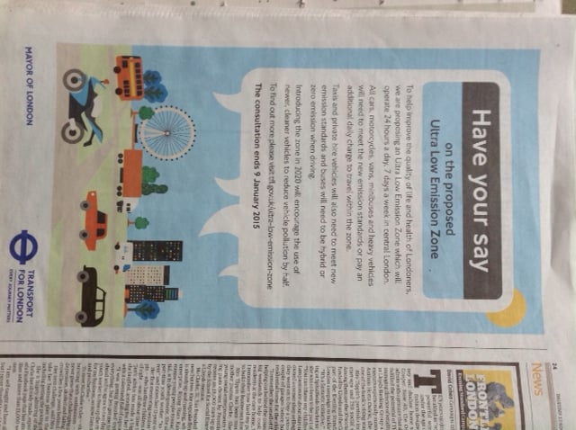 I am writing on behalf of Clean Air in London (CAL) to lodge a serious compliant about advertising by or on behalf of the Mayor of London for the proposed Ultra Low Emission Zone (ULEZ) that was published in the Evening Standard on 13 November 2014 (image attached in Appendix).