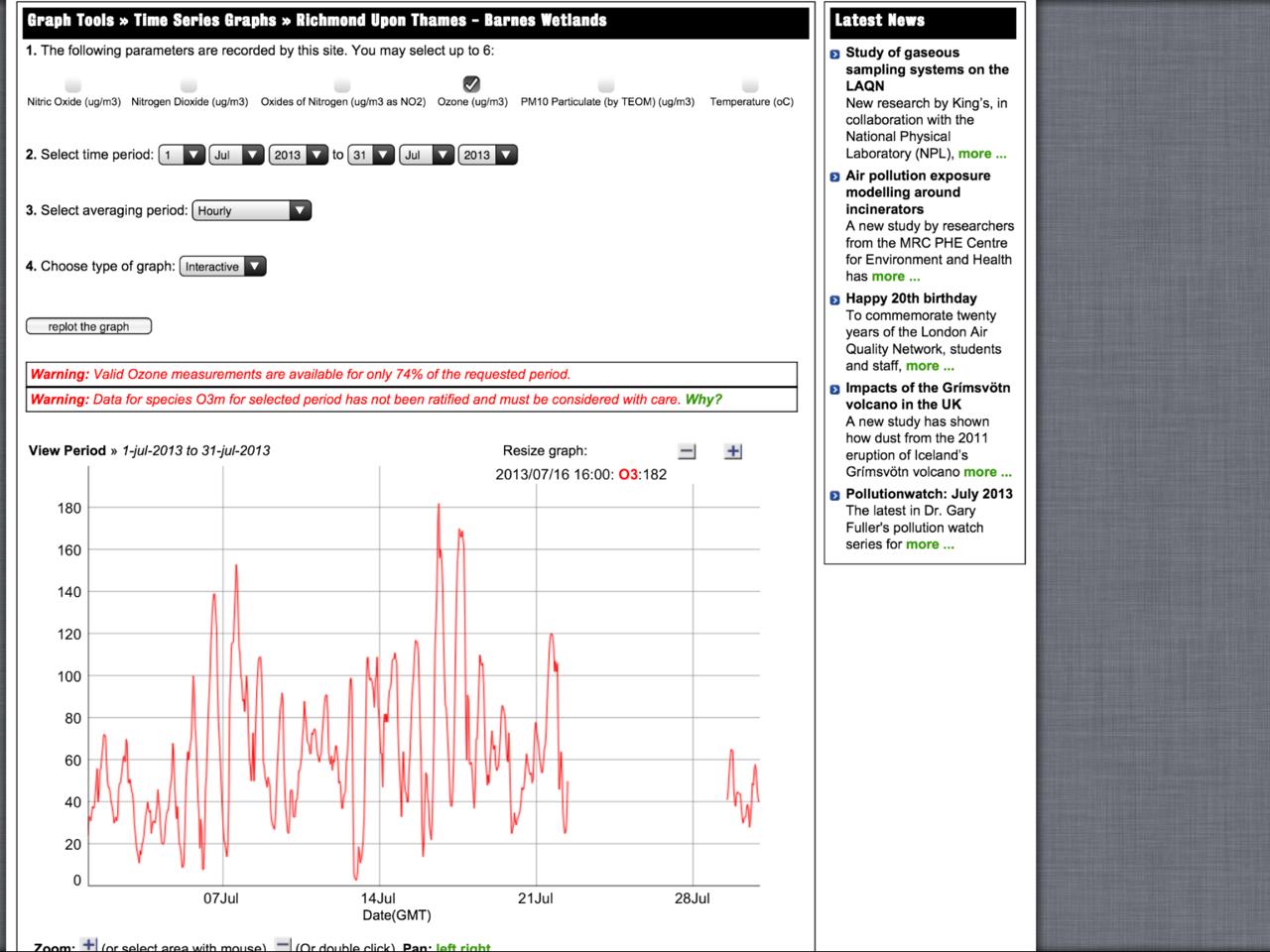 The first legal breach occurred when the excellent London Air Quality Network’s (LAQN) monitor in Richmond – Barnes Wetlands recorded average one-hour ozone of 182 ug/m3 at 1600 on Tuesday 16 July. See Exhibit 1: